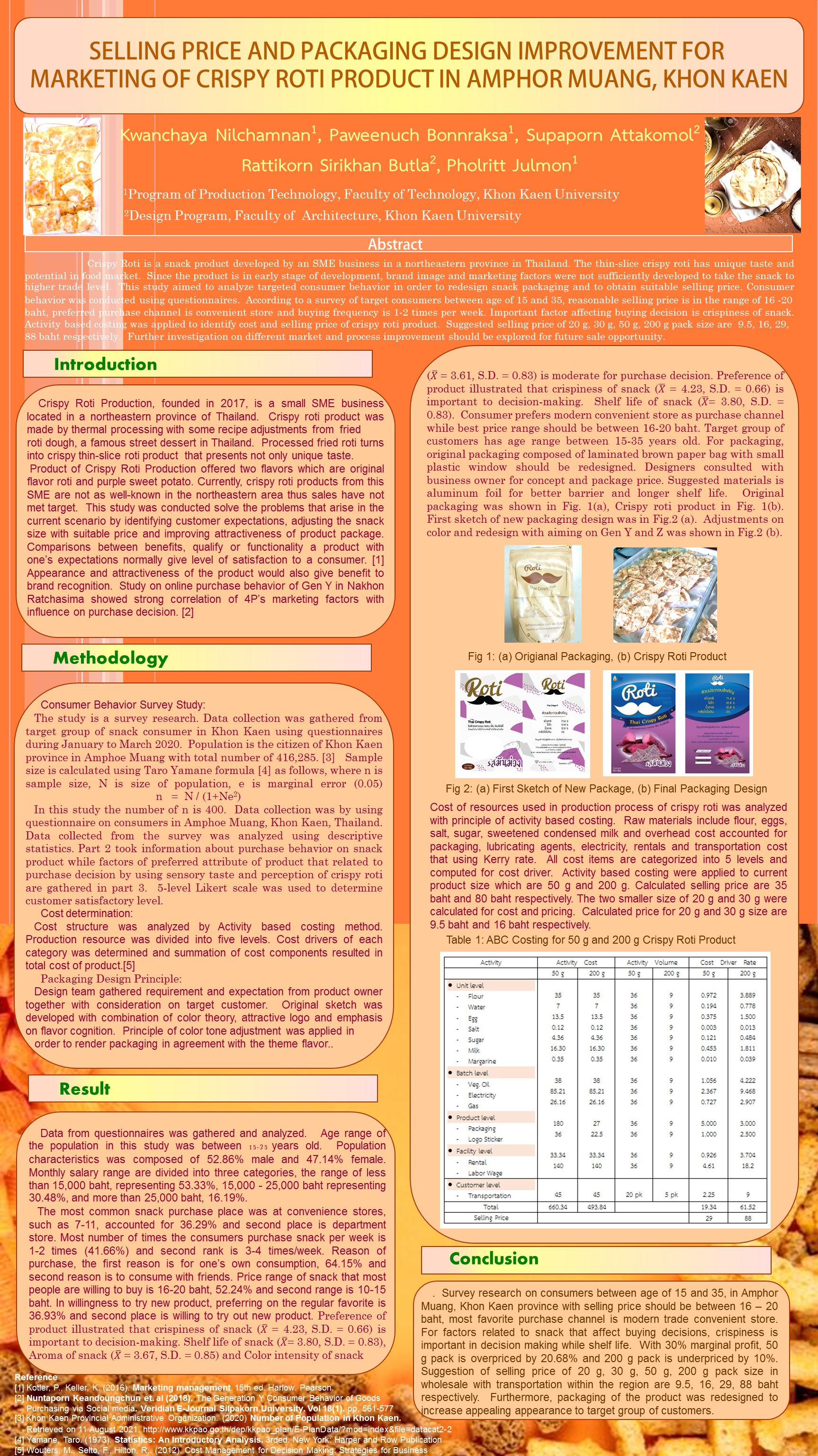 <h1>SELLING PRICE AND PACKAGING DESIGN IMPROVEMENT FOR MARKETING OF CRISPY ROTI PRODUCT IN AMPHOR MUANG, KHON KAEN</h1>