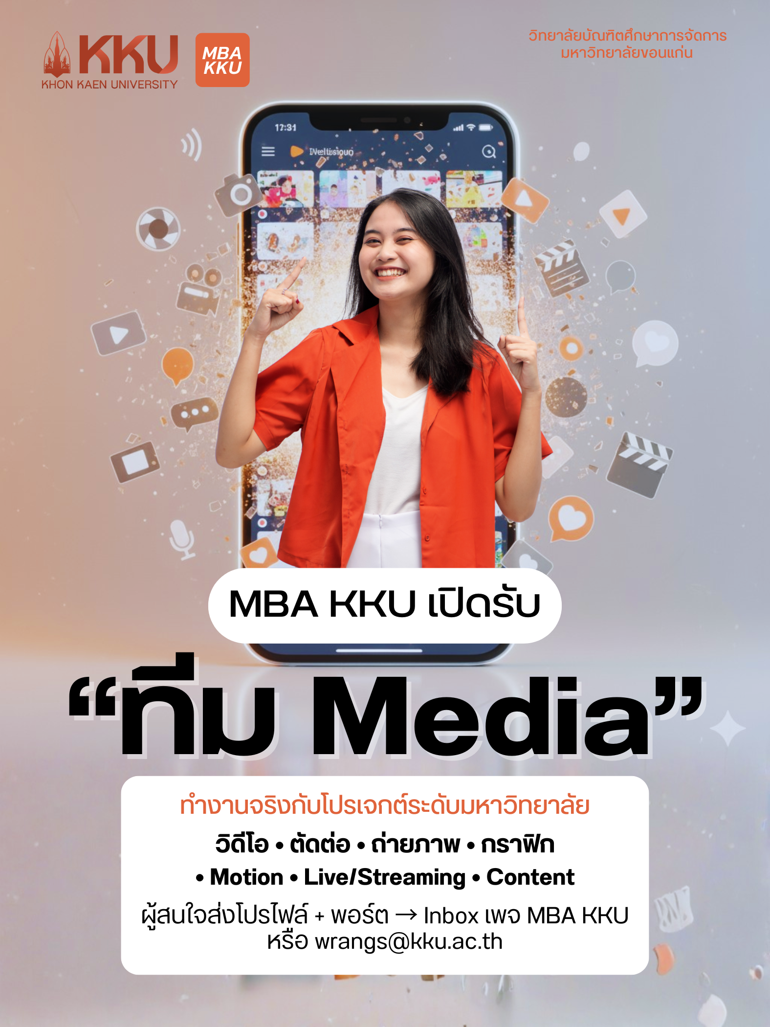 MBA KKU กำลังหา “ทีม Media” ร่วมลุยงานจริง! เราตามหา Creators/Production ที่ไฟแรง คิดไว ทำไว และรักงานคุณภาพ มาร่วมสร้างสรรค์สื่อให้โปรเจกต์ของ MBA KKU