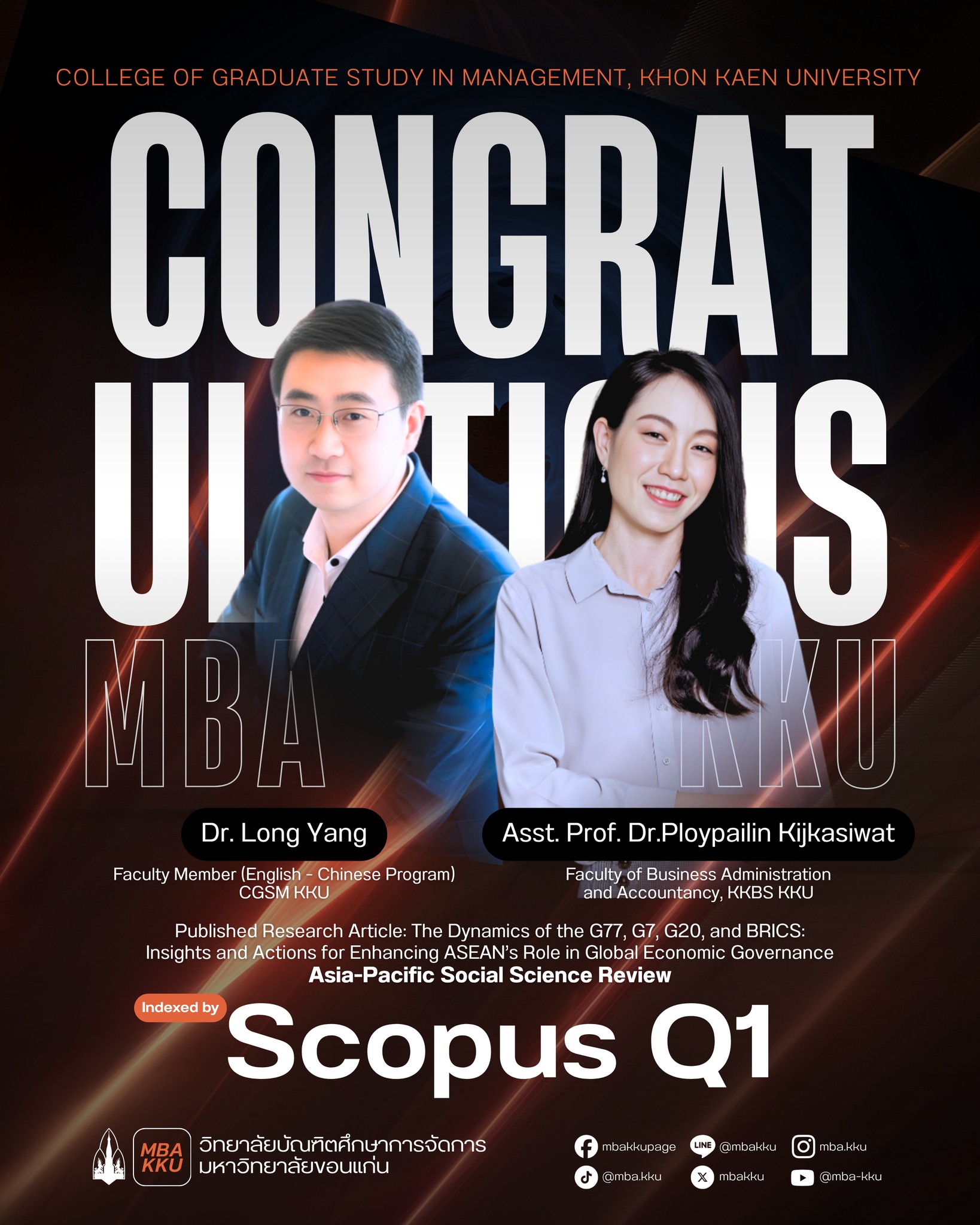 Congratulations to Dr. Long Yang from the College of Graduate Study in Management, Khon Kaen University, and Asst. Prof. Dr. Ploypailin Kijkasiwat from the Faculty of Business Administration and Accountancy, Khon Kaen University, on their jointly authored research article being published in the Asia-Pacific Social Science Review, a journal indexed in Scopus Q1.